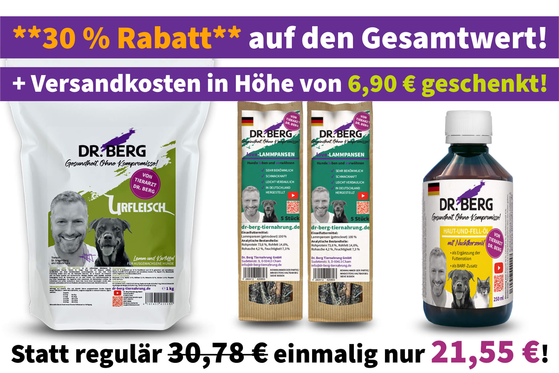 Vertrauen ist das Fundament unserer Beziehung zu Dir und Deinem Hund. Dr. Berg Tiernahrung steht für Qualität, Gesundheit und Authentizität. Egal was wir tun, alles basiert auf wissenschaftlichen Erkenntnissen und unserer langjährigen Erfahrung. Wir legen großen Wert darauf, nur die besten Zutaten zu verwenden und unser Futter nach den höchsten Standards zu produzieren. Du kannst Dich auf unsere Expertise und unser Engagement für das Wohl Deines Hundes verlassen. Gesundheit hat für uns höchste Priorität. Schau dazu gerne die Bewertungen unserer zufriedenen Kunden an, die Du unten auf dieser Seite, auf Google oder auch auf unserer Facebookseite findest.